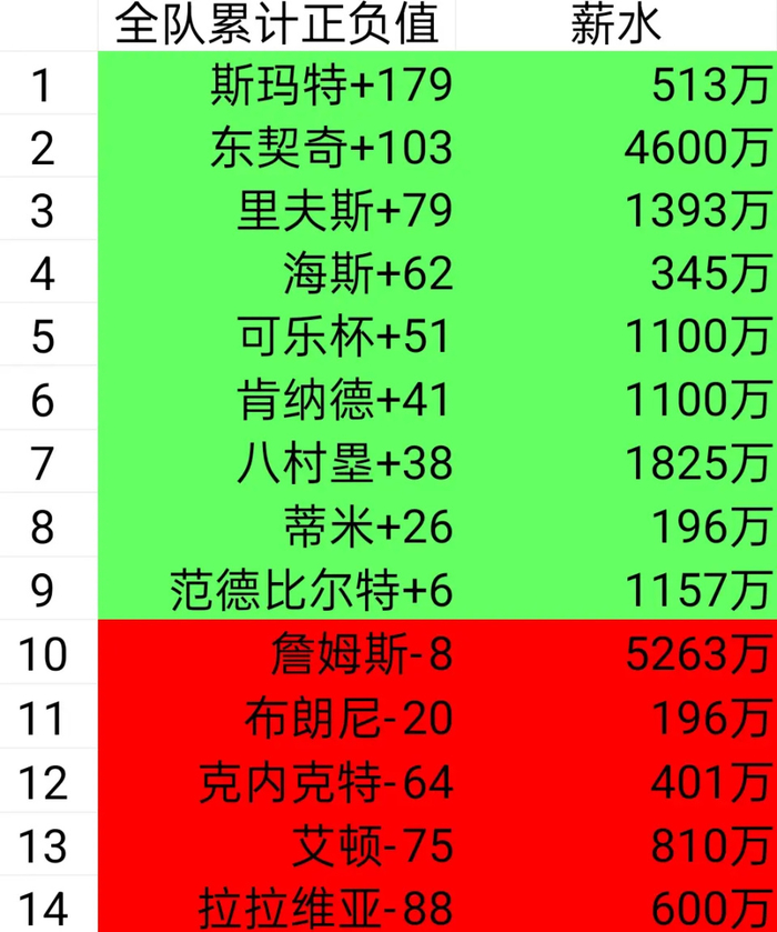 斯玛特以全队最高的+179正负值高居榜首,而他的年薪仅为513万美元。这位以防守和强硬著称的后卫,用实际行动证明了自己的价值,成为湖人攻防两端最可靠的"粘合剂",堪称本赛季联盟性价比最高的引援之一。